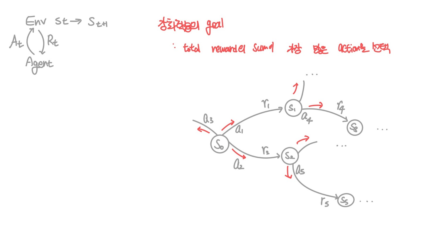 지난 강의를 바탕으로 강화학습의 목표는 total reward의 sum을 maximize하는 action을 선택하는 것이라고 정의할 수 있다. 하지만 $A_t /to A_{t+1}$의 과정에서 $R_t$를 알 수 있기 때문에, t 시점에서 $A_{t+1},R_{t+1},\cdots$를 모두 알 순 없다.