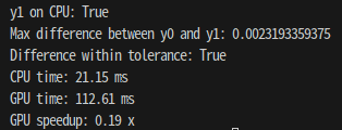 성능은 CPU가 훨씬 좋았다. 이는 몇가지 이유가 있는데, CPU에서 GPU로 옮기는 과정에서 더 많은 시간을 잡아먹기 때문에, GPU 기반 연산 결과가 훨씬 더 느릴 수 있다. 이는 소량의 데이터 혹은 작은 연산에서 GPU 연산이 더 비효율적일 수 있다.