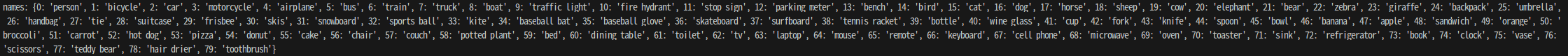 results.names를 출력하면 다음과 같다. 해당 Model이 학습한 전체 Class 정보를 확인할 수 있다.