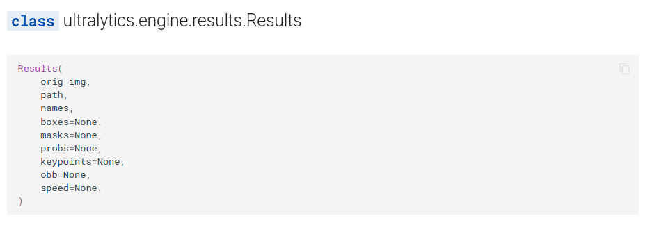 객체 검출 결과인 results은 ultralytics.engine.results.Results Class이다. 이에 대한 정확한 정보는 공식 문서에서 확인할 수 있다.