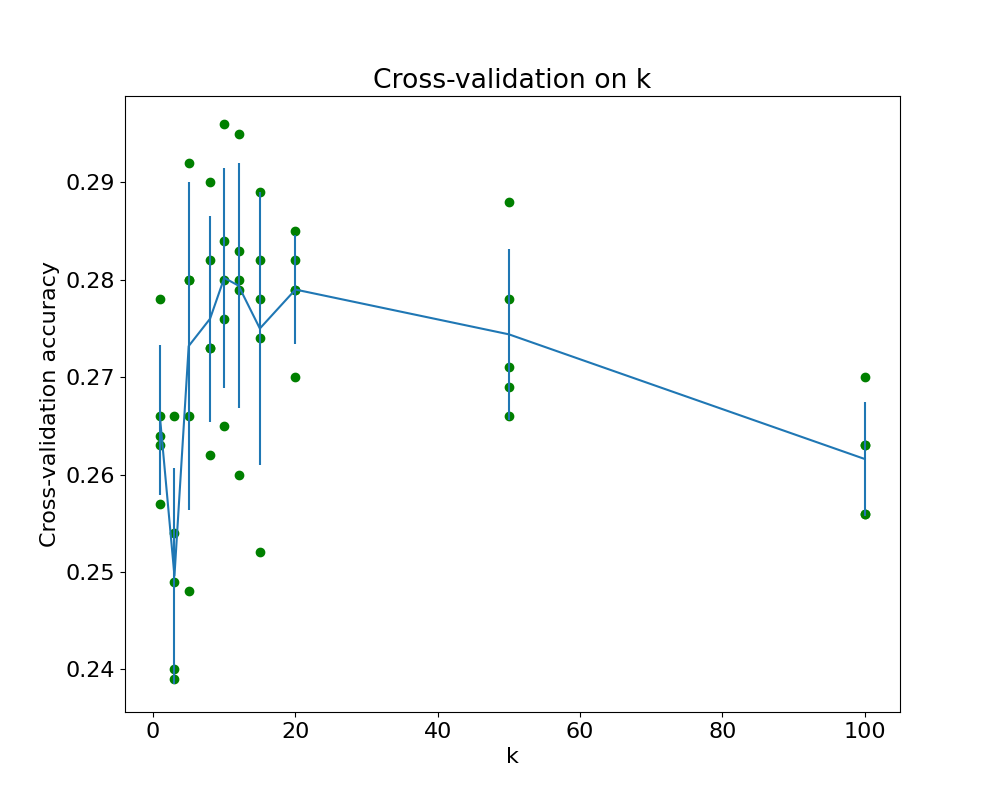 # k = 10 got accuracies: [0.265, 0.296, 0.276, 0.284, 0.28]