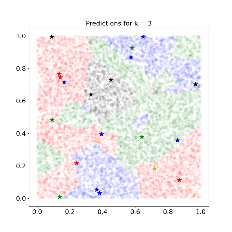 k 값이 증가될수록 Overfitting이 줄어듬을 확인할 수 있다. 하지만, 너무 많은 k를 고려함에 따라 클래스가 잘못 할당된 것 처럼 보이기도 하며, k개 안에 학습 데이터 클래스의 빈도수가 동일한 경우 더 작은 클래스로 할당되기에 납득되지 못하는 결과가 발생하기도 한다. 예를 들어, k=3인 경우 초록색 클래스를 가지는 학습 데이터 인근의 테스트 데이터도 빨간색 클래스로 할당되어있는데, 이는 빨간색 클래스가 더 작은 Index를 가지는 클래스이기 때문이다.