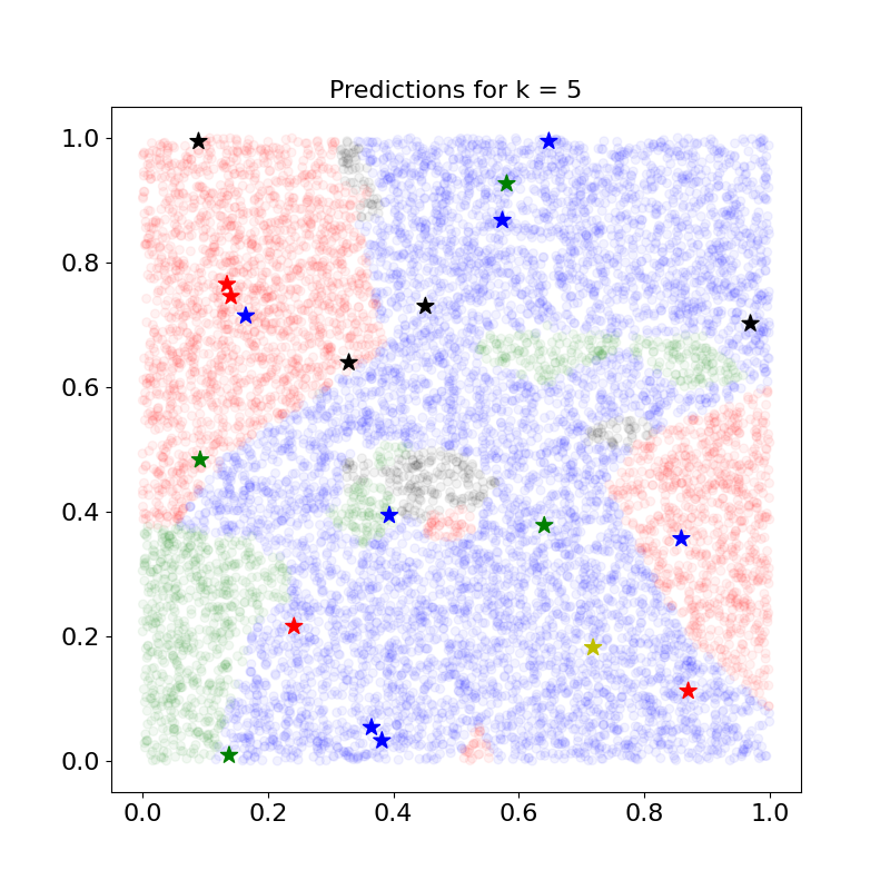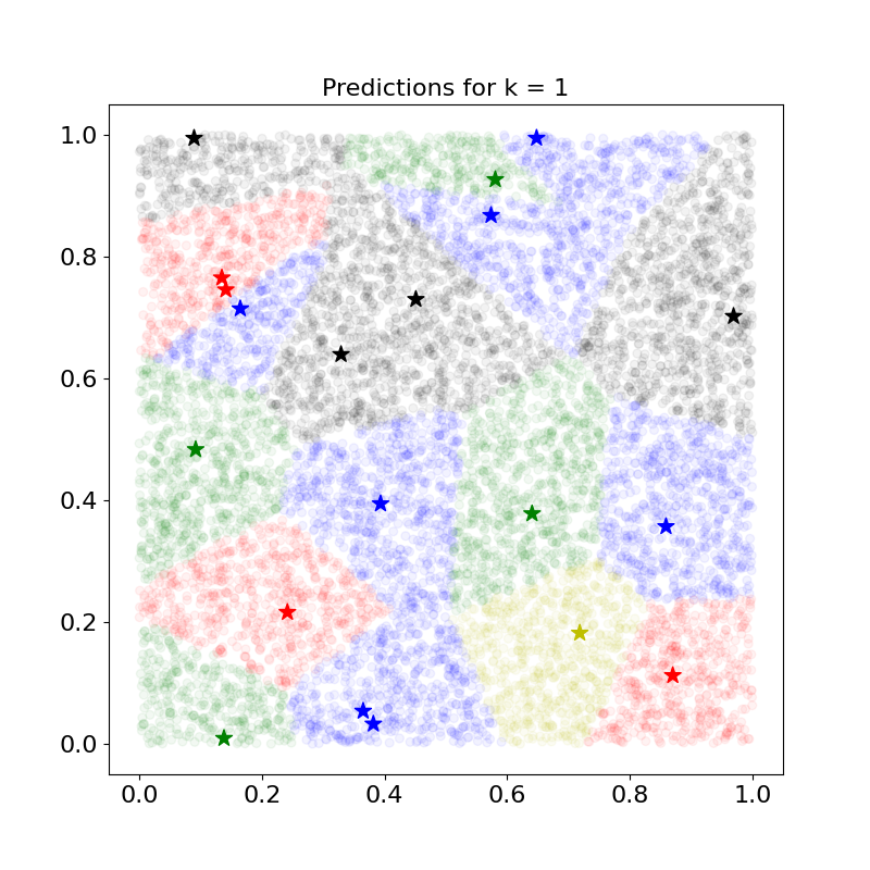 별이 학습 데이터, 원이 테스트 데이터를 시각화 한 것이다. 현재는 자신과 가장 가까운 학습 데이터의 클래스만(k=1) 고려됨을 확인할 수 있다.
