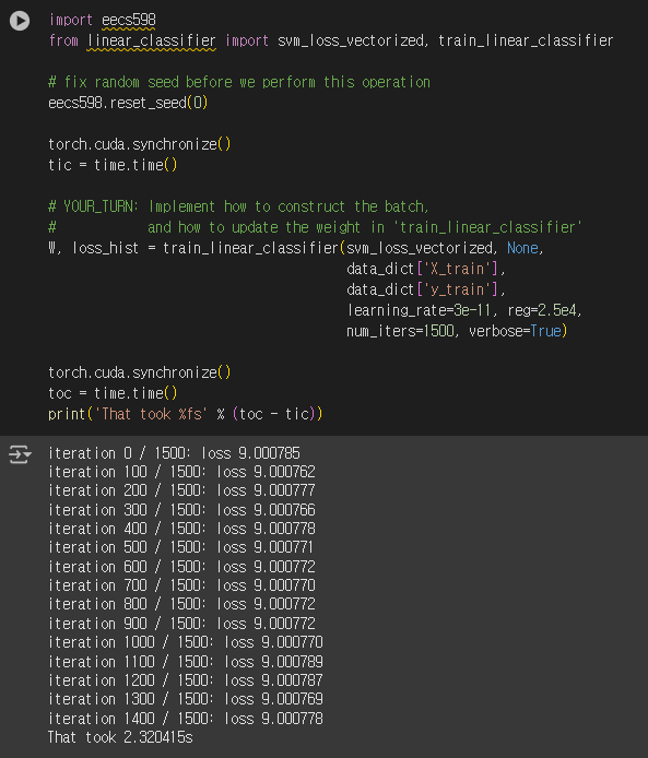 이제 Linear Classifier를 학습시켜 보자. 먼저 Weight Matrix를 작은 난수로 초기화 시킨 뒤, num_iters만큼 반복하면서 학습을 진행한다. SGD를 위해 입력받은 batch_size만큼의 batch를 무작위로 생성한다. 이렇게 생성된 X_batch는 (batch_size, X.shape[1])의 크기를 가진다. 이후 loss_func을 이용해 Loss와 Gradient를 계산한 뒤, Gradient Descent로 Weight Matrix를 Update 한다.