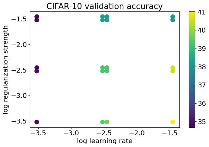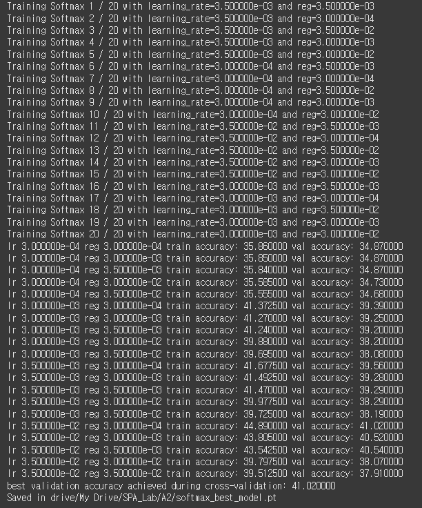 총 20가지의 조합 중 lr = 35e-2, reg = 3e-4 임을 확인할 수 있다. 각 조합에 대한 Accuracy는 다음과 같다.
