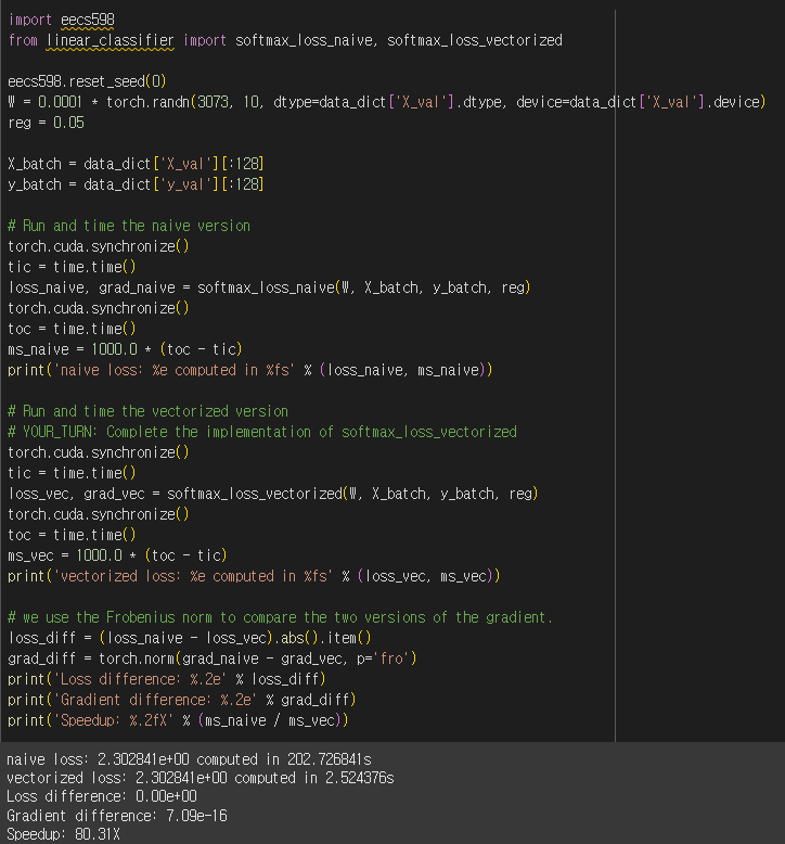Vectorize Softmax Loss의 경우는 명시적인 Loop 없이 구현 해 주었다. X.mm(W)로 전체 score를 계산한 뒤, 각 행에 대한 Max Score를 구하고 torch.view(-1,1)를 통해 행이 아닌 열로 변형하여 Broadcasting을 활용해 계산하였다.