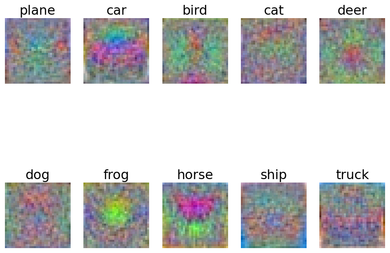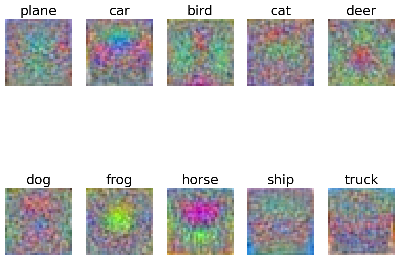 실제로 모델의 Weight Matrix를 plot 해 보면 다음과 같다. Softmax Classifier 보다 더 정확도가 높고, 학습이 잘 되었기에 실제로 각 클래스의 객체처럼 보이지는 않지만, 무언가를 학습하고 있는 것 처럼 보이긴 한다. 하지만 뭔진 모른다.