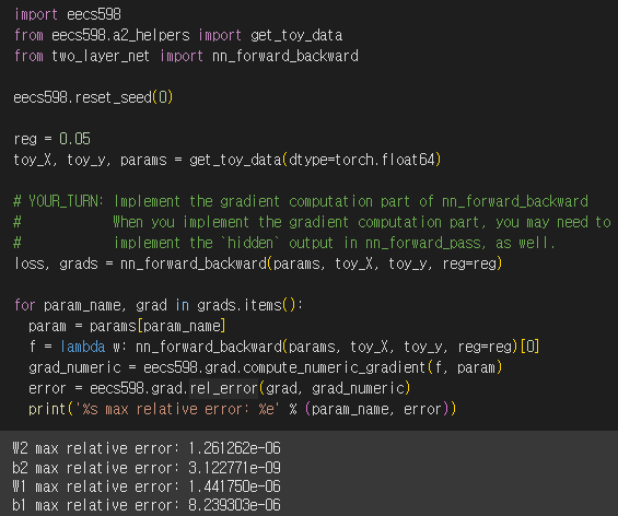Error가 1e-4보다 모두 작은것을 보아 Gradient를 잘 구했음을 확인할 수 있다.