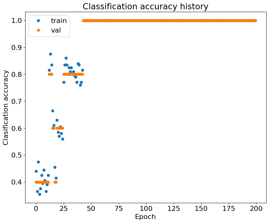 Train Iteration이 증가하면서 Loss가 줄어듬을 확인할 수 있으며, Train, Validation Accuracy도 Iteration이 증가하면서 증가함을 확인할 수 있다. 하지만, Epoch이 50이 넘어가면서부터 이미 Acc가 1에 가까운 정확도를 보인다. 이는 Loss History에서도 75 Epoch 이후부터는 감소율이 거의 보이지 않음을 확인할 수 있다.