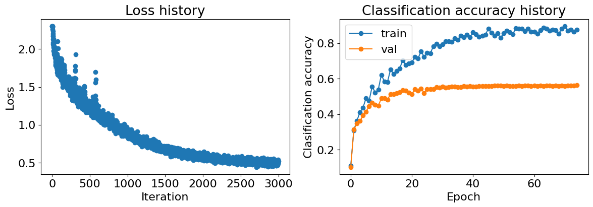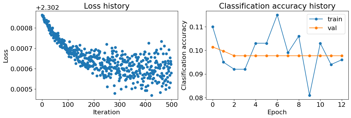 net = TwoLayerNet(input_size, hidden_size, num_classes, dtype=data_dict['X_train'].dtype, device=data_dict['X_train'].device)