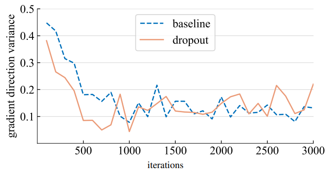 초기 학습 단계에서 미니배치간의 Gradient Variance를 감소시킨다. SGD(Stochastic Gradient Descent)는 미니배치에서 계산된 Gradient를 기반으로 Weight를 Update 하지만, 확률적으로 Sampling 된 미니배치는 서로 다른 분포를 가지기에 Gradient의 방향이 불안정할 수 있다. 따라서 Dropout을 통해 무작위로 뉴런을 비활성화 하여 일관된 Gradient 방향을 유지하도록 즉, 미니배치 Sampling에 덜 민감하도록 한다. 특히 해당 방향은 전체 데이터셋의 Gradient Driection과 정렬(유사)됨을 확인할 수 있다.