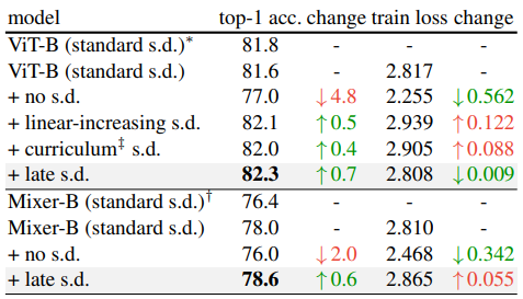 Table 4를 통해 Late s.d.가 표준 s.d.에 비해 Test Accuracy가 향상됨을 확인할 수 있다. 특히 Mixer-B의 경우 Train Loss는 증가하였지만, Accuracy는 향상 되었음을 확인할 수 있다. 또한, 여러 Dropout Strength Stragy와 비교했을 때도, Late s.d.가 더 우수한 성능을 보임을 확인할 수 있다.