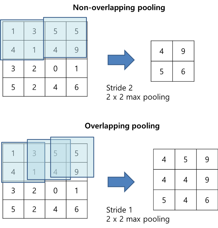 Pooling Layer는 같은 Kernel Map(Activation Map)에서 인접한 뉴런들의 출력을 요약하는 과정이다. 즉, 더 작은 크기로 중요한 특징은 유지하는 방법이다. 일반적으로 Stride Size $s$와 Filter size $z$라 하면, $s=z$로 하여 겹치는 부분 없이 Pooling을 진행한다. 만약 $s < z$인 경우 Figure 5와 같이 Pooling 되는 부분이 겹치는 Overlapping Pooling이 발생한다.