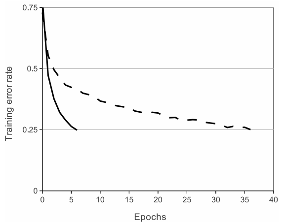 동일한 4개의 층을 가지는 CNN에 대하여 CIFAR-10 Dataset에 대한 25%의 Training Error Rate를 가지는 학습 속도를 비교한 결과, Figure 4와 같이 ReLU를 사용한 것이 tanh를 사용한 것보다 학습 속도가 매우 빠른 것(6배)을 확인할 수 있다. 이때, 실선이 ReLU, 점선이 tanh를 Activation Function으로 사용한 경우이다.