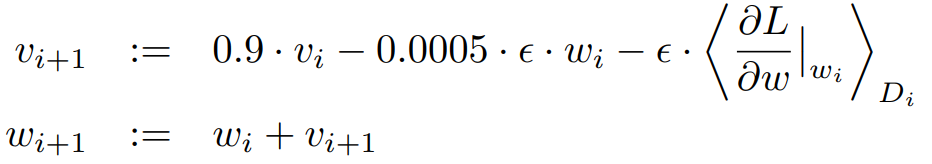 이때, $i$는 Iteration Index, $v$는 Momentum Value, $\varepsilon$는 Learning Rate, $\left< \frac{\partial L}{\partial w}|_{w_i} \right>_{D_i}$는 $i$번째 Batch $D_i$에 대한 평균 Gradient이다.