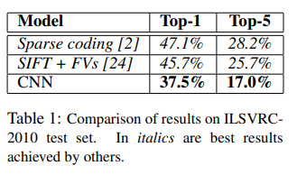 top-1 error는 37.5%, top-5 error는 17.0%로 기존 최고 성능을 보인 수치보다 훨씬 향상된 수치이다. 기존 최고 성능을 보인 모델의 경우 Coding 기반의 모델과 SIFT와 같은 특징들이 결합된 Feature Representation 중 하나인 Fisher Vectors를 학습한 모델이다. 이는 CNN의 성능이 Feauture 기반의 방법보다 훨씬 압도적인 성능을 보임을 의미한다.