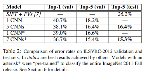 ILSVRC-2012에 제출한 모델의 성능은 다음과 같다. Table 2의 5 CNNs는 비슷한 5개의 CNNs 예측의 평균을 의미한다. *는 본 논문에서 제안한 Network에서 마지막 Pooling Lyaer 이후 하나의 Conv Layer를 추가시킨 CNN에 대하여 ImageNet Fall 2011 Dataset에 대하여 학습시킨 뒤, ILSVRC-2012에 대하여 Fine Tuning 시킨 모델이다.