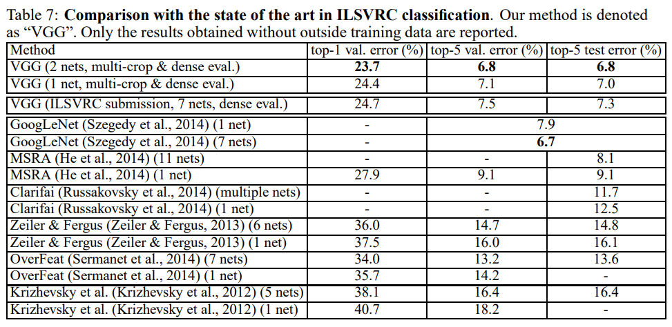 또한 동일한 네트워크에 대하여 학습과정에서 Scale jittering을 사용한 경우가 다른 단일 Scale에 대하여 학습한 경우보다 성능이 좋음을 확인할 수 있다. 이를 통해, 다중 스케일에 대한 학습이 네트워크의 성능 향상에 효과적임을 확인할 수 있다.