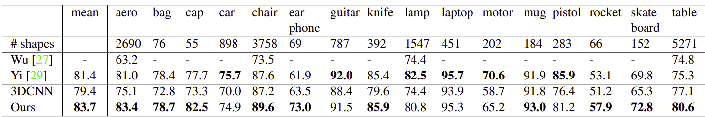 [27],[29]는 Point-wise Geometry Feature과 Correspondences between shapes(형상 간 대응)을 활용한 방법이다. PointNet이 전반적으로 우수한 성능을 보이지만, 일부 Class에 대해서는 낮은 정확도를 보인다.