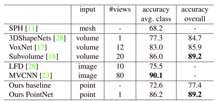 전통적인 Point Cloud Feature Extraction(점 밀도, D2 거리, Shape Contour, etc)을 사용한 MLP Model들과 비교한 결과 우수한 성능을 보인다. 여전히 멀티뷰 렌더링 기반인 MVCNN의 성능보다는 약간 낮은 수준인데, 이는 하나의 객체에 대한 여러 장의 이미지에서 얻을 수 있는 Feature(기하학적 특징)를 PointNet에서는 얻지 못하기 때문이다.
