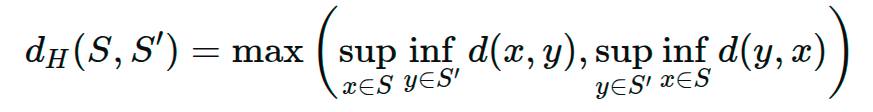 Hausdorff Distance는 $S, S"$에 대해서 각 점이 서로 가장 가까운 점 까지의 거리 중 최댓값을 의미한다. 따라서 $S, S'$이 하나라도 차이가 나면 $d_H(S, S')$이 커지게 되기 때문에, 두 점 집합의 유사도를 측정할 수 있다.
