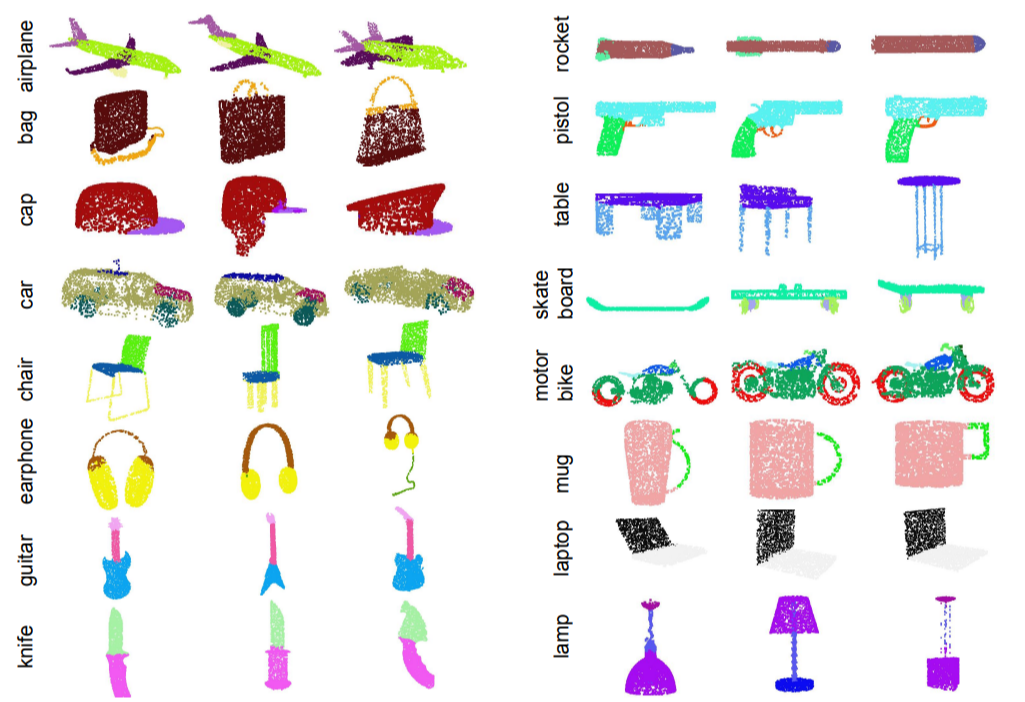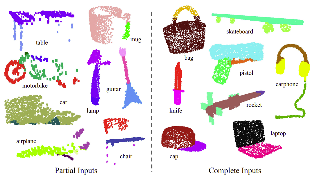 - 하나의 객체에 대한 Point Cloud $\to$ Part Region Segmentation(부위별 세분화)