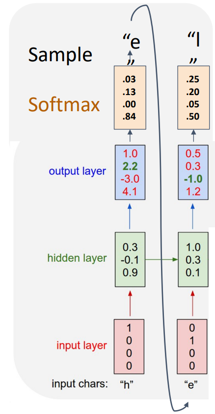 아래와 같이 Model이 표현할 수 있는 Vocabulary가 존재하며, 이를 기반으로 Input Chars는 One-hot Vector로 표현되된다. 이후 각각의 Input에 대하여 Hidden State가 계산되고, 본 Task는 다음 단어를 예측하는 것이기 때문에 Output에 대하여 Softmax를 거쳐 다음 단어를 예측할 수 있다. 이때의 Loss는 Cross-entropy Loss이다.