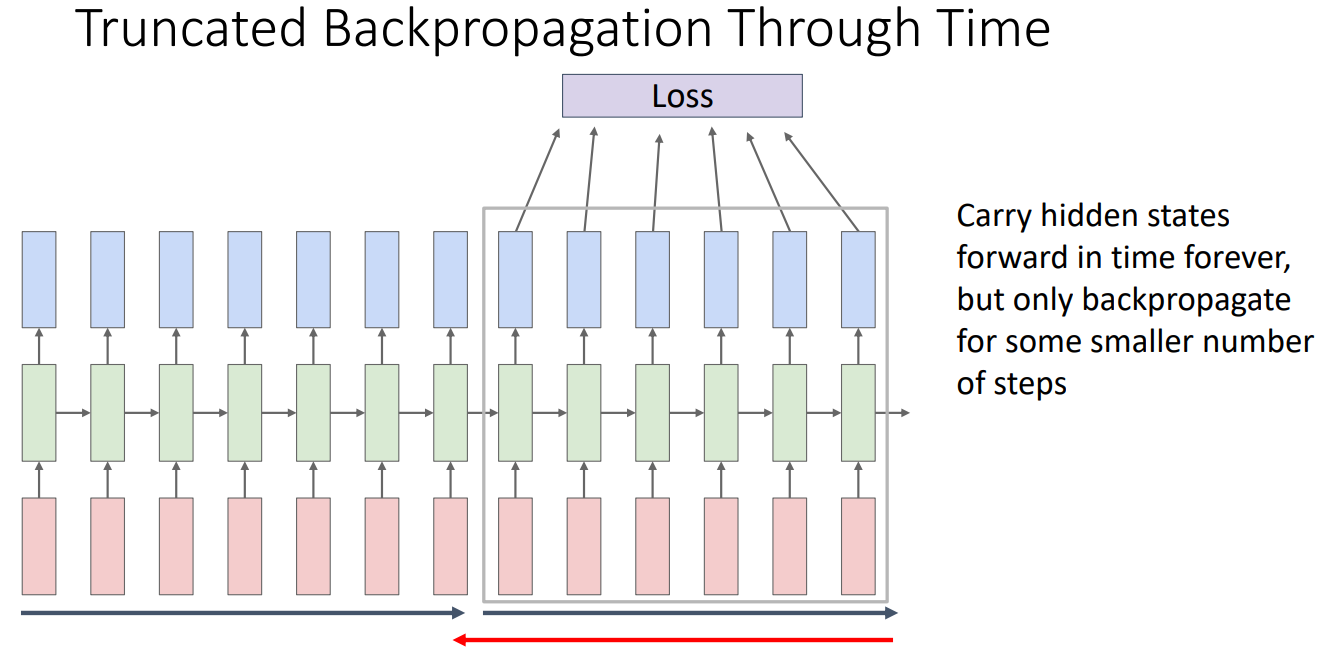 또한, BPTT의 경우 각각의 Time Step에서의 Gradient를 계산해야 하기 때문에 저장해야 하는 값도 많아져 Memory와 Computational Cost가 높아진다. 이를 해결하기 위한 한 방법이 Truncated Backpropagation Through Time이다.