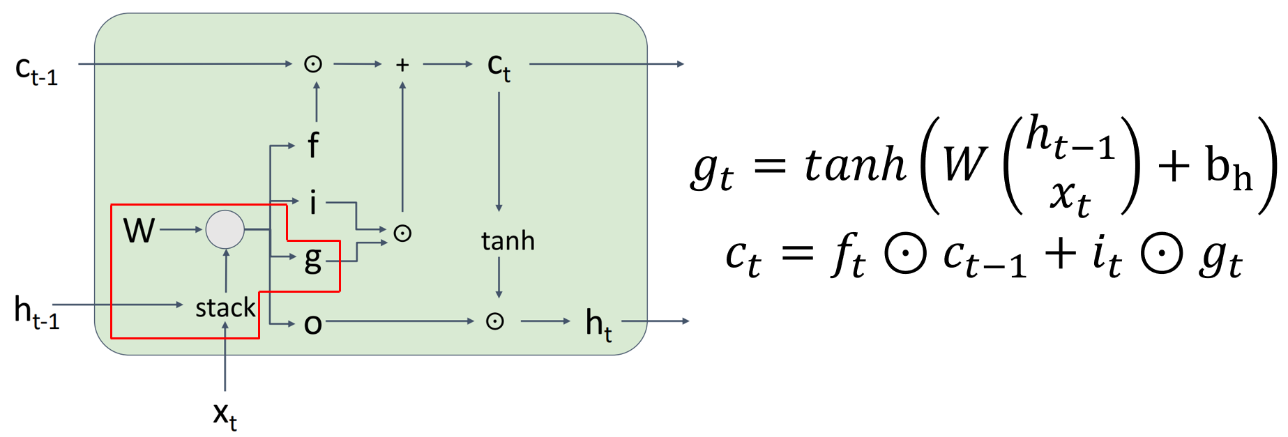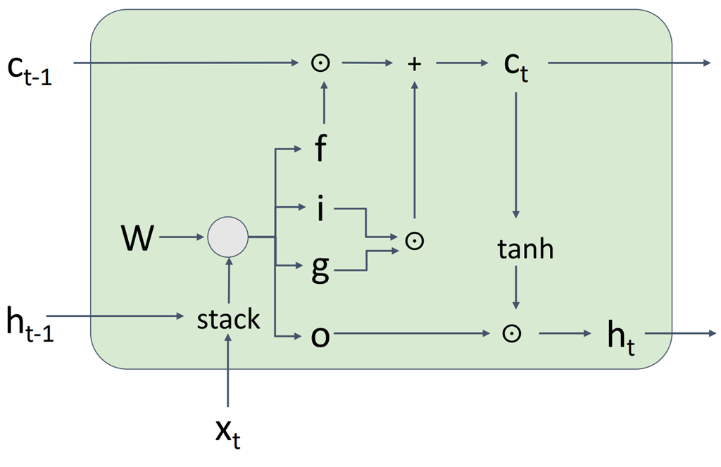 LSTM은 $h_{t-1}, x_t$로 $h_t$를 바로 계산하는 Vanilla RNN과 달리, $h_{t-1}, x_t$로 각각의 Gate를 계산한 뒤, 이를 기반으로 $c_t, h_t$를 계산하게 된다.