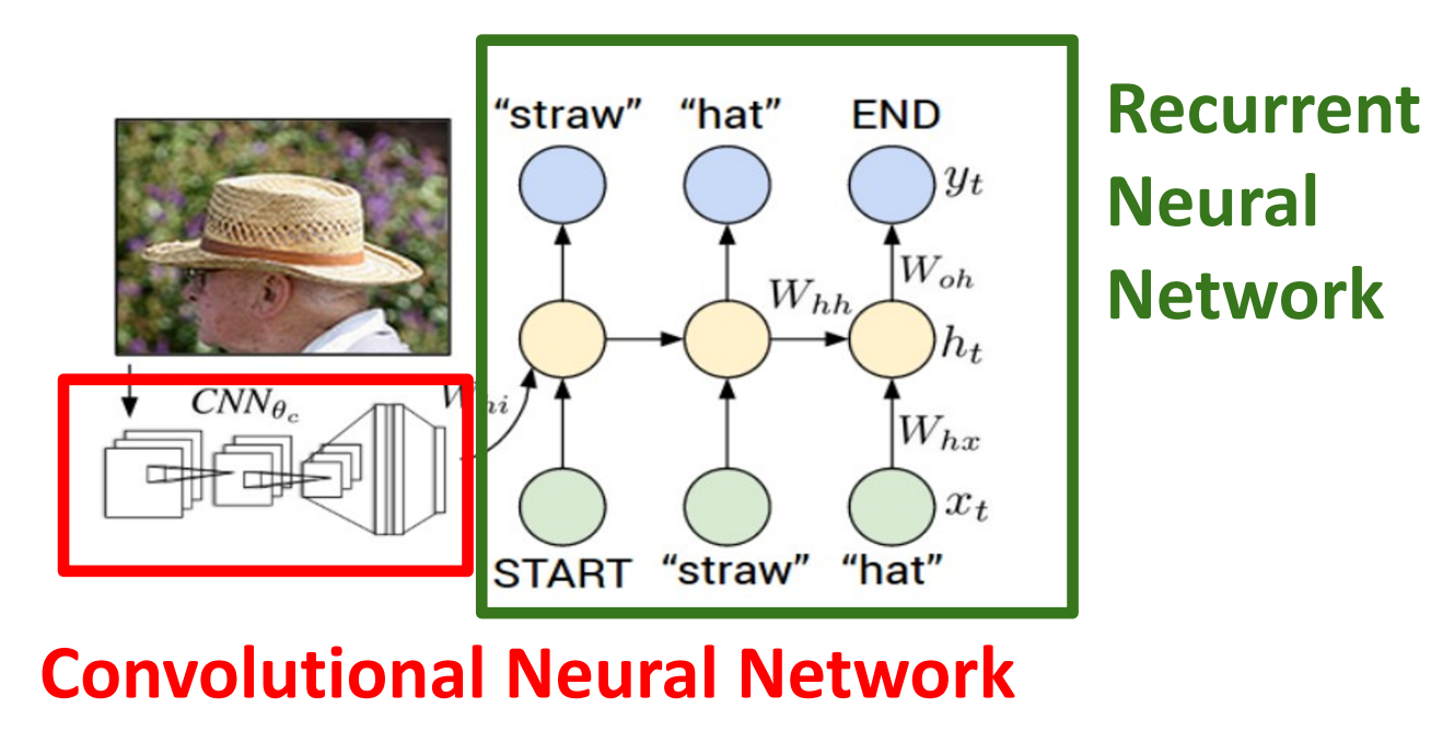 Image Captioning은 Image를 Input으로 하여 Image에 대한 설명을 Output으로 하는 Task 이다. 이는 단순히 RNN만 사용하는 것이 아닌, Image에 대하여 CNN을 통해 Feature를 추출하고, 추출된 Feature Vector를 $W_{ih}$와 곱하여 RNN에서 처리된다.