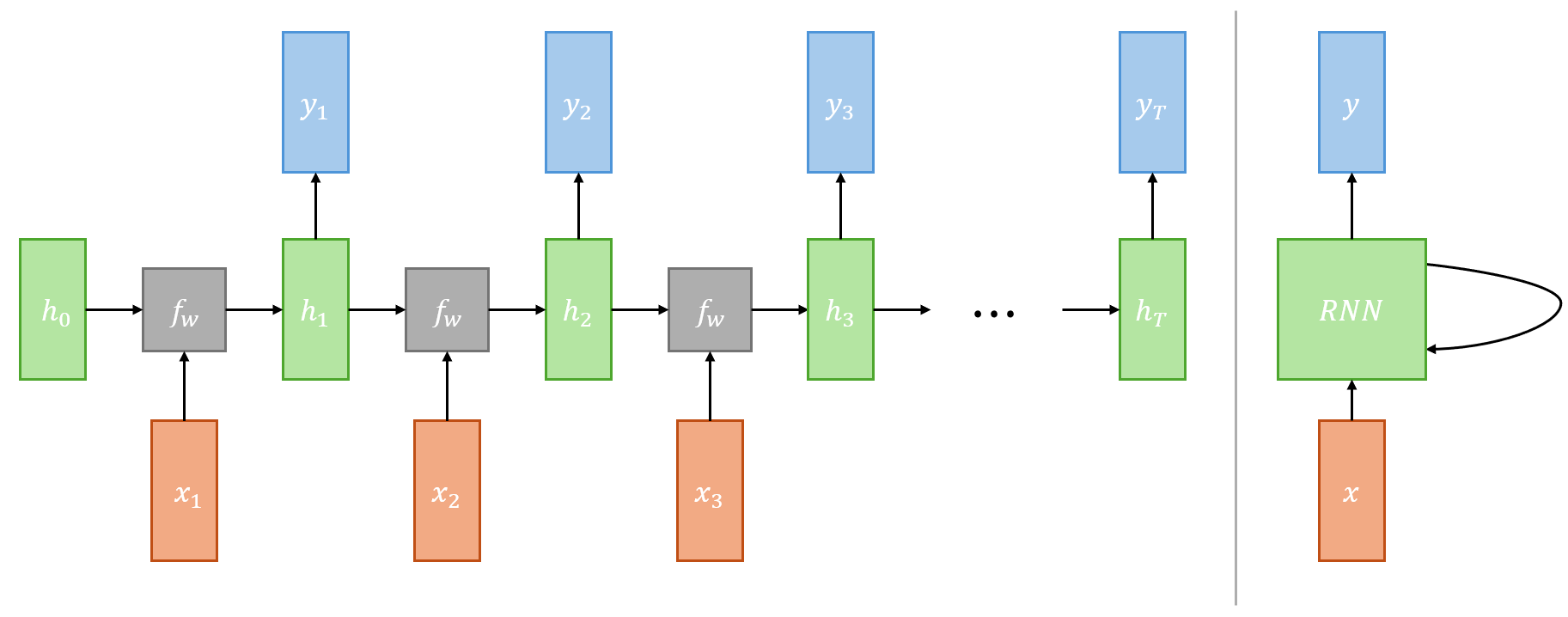 이때, $h$는 Hidden State, $x$는 Input, $f_W$는 $W$ Parameter를 가지는 Function이다. 여기서 한가지 특징은, 전체 과정에서 $W$는 공유된다는 점이다. 이를 통해 Input Sequence의 Length에 제한되지 않고, 임의의 Length에 대해서 동일한 연산을 반복하여 처리할 수 있다.
