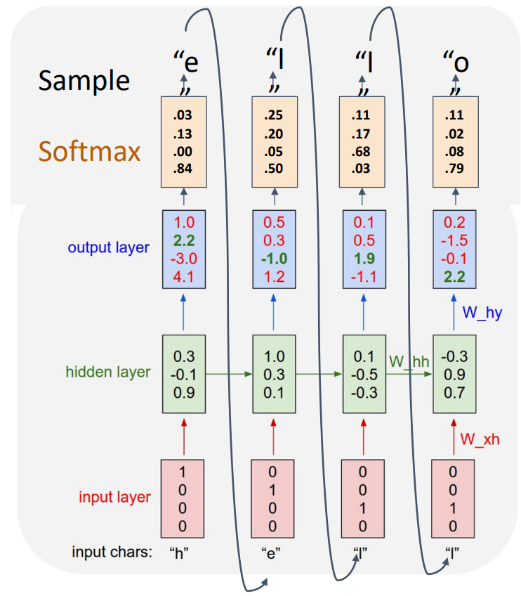 아래와 같이 Model이 표현할 수 있는 Vocabulary가 존재하며, 이를 기반으로 Input Chars는 One-hot Vector로 표현되된다. 이후 각각의 Input에 대하여 Hidden State가 계산되고, 본 Task는 다음 단어를 예측하는 것이기 때문에 Output에 대하여 Softmax를 거쳐 다음 단어를 예측할 수 있다. 이때의 Loss는 Cross-entropy Loss이다.