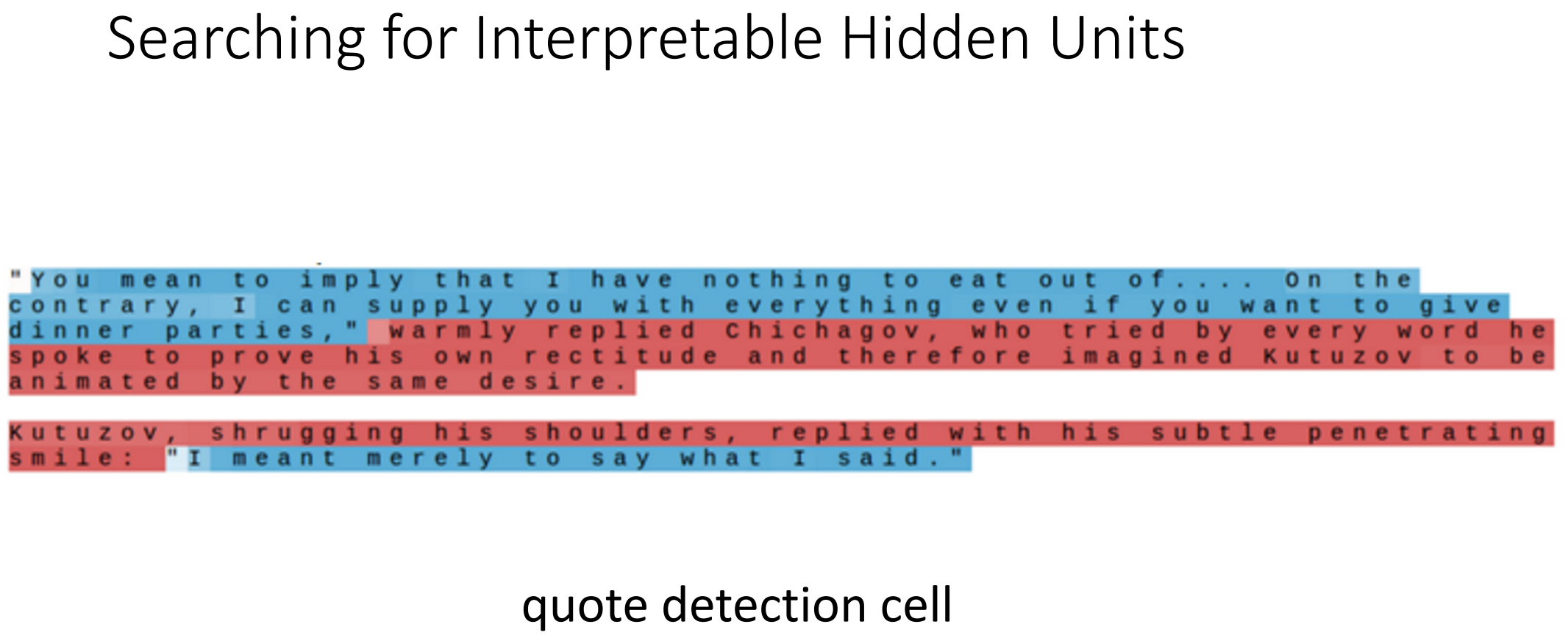 LSTM의 Hidden State를 색상으로 시각화한 결과, 따옴표(")의 시작과 끝에서 특정 Hidden Unit이 활성화되거나 비활성화되는 Binary Switching 현상이 관찰되었다. 이는 LSTM이 문장의 구조를 학습하며, 따옴표 내부의 내용을 문맥적으로 구별하는 역할을 수행할 수 있음을 의미한다.