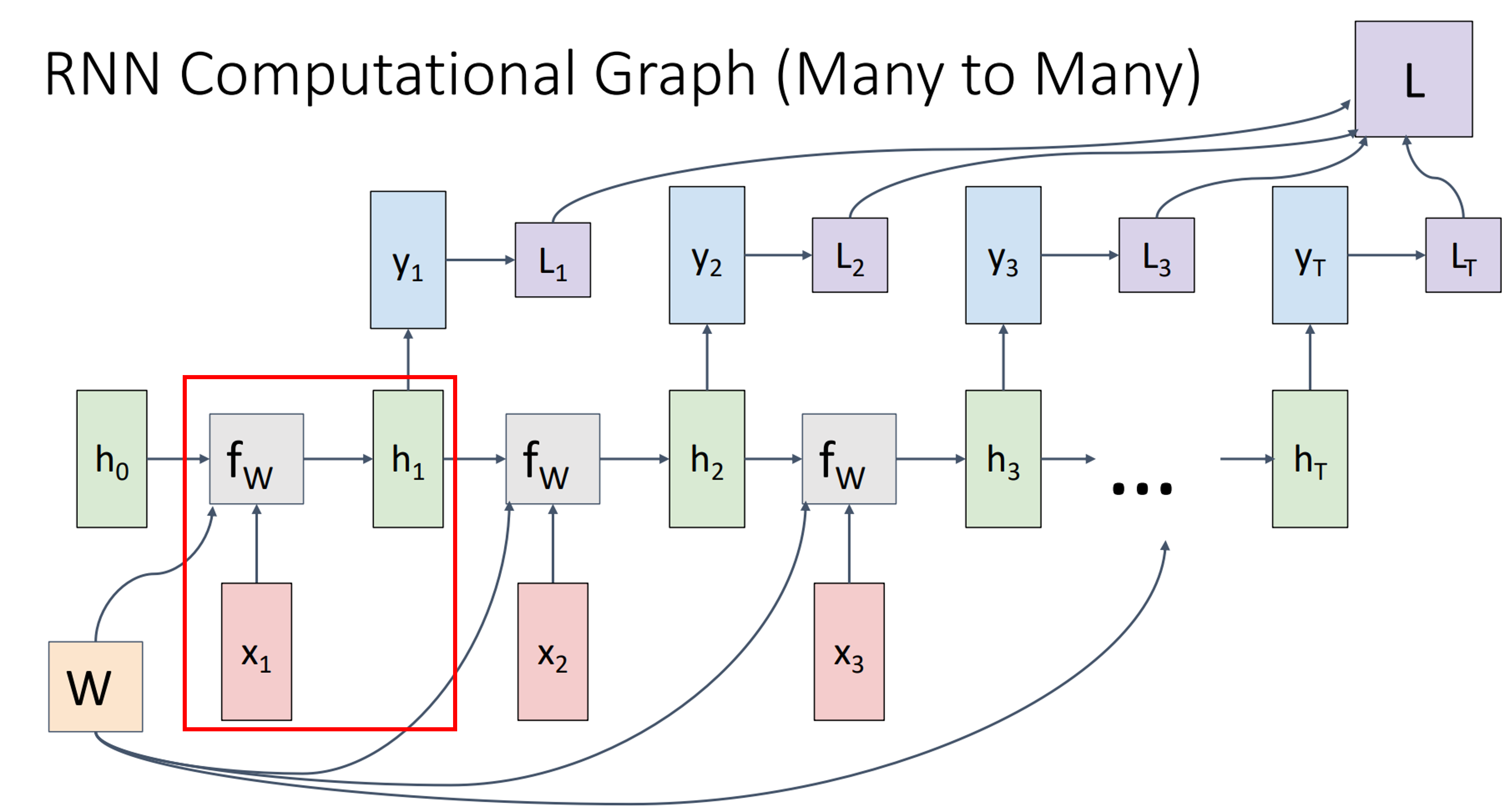 Sequence Data를 처리하는 경우 전체 Sequence를 처리한 뒤, Backward가 진행되는데, 앞선 Forward 과정을 살펴보면 $f_W$에서 $W$는 공유됨을 확인할 수 있다. 따라서 Gradient를 계산할 때 모든 Sequence에 대해서 누적되는 현상이 발생한다. 최종적인 Gradient는 $ \frac{\partial L}{\partial W} = \sum_{t=1}^{T}\frac{\partial L_t}{\partial W}$이며, 누적된 각 Sequence 에서의 Gradient의 합이 된다.