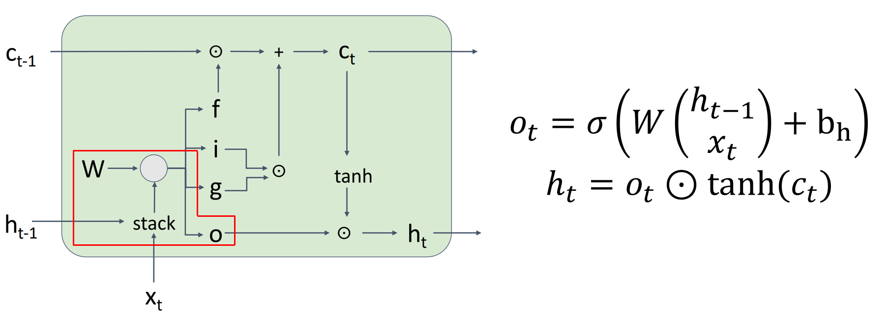 LSTM은 $h_{t-1}, x_t$로 $h_t$를 바로 계산하는 Vanilla RNN과 달리, $h_{t-1}, x_t$로 각각의 Gate를 계산한 뒤, 이를 기반으로 $c_t, h_t$를 계산하게 된다.