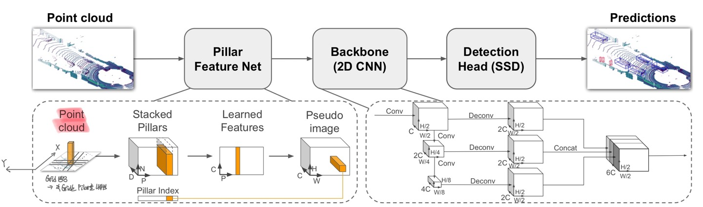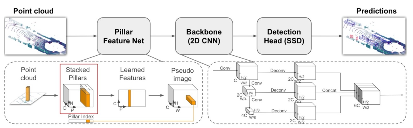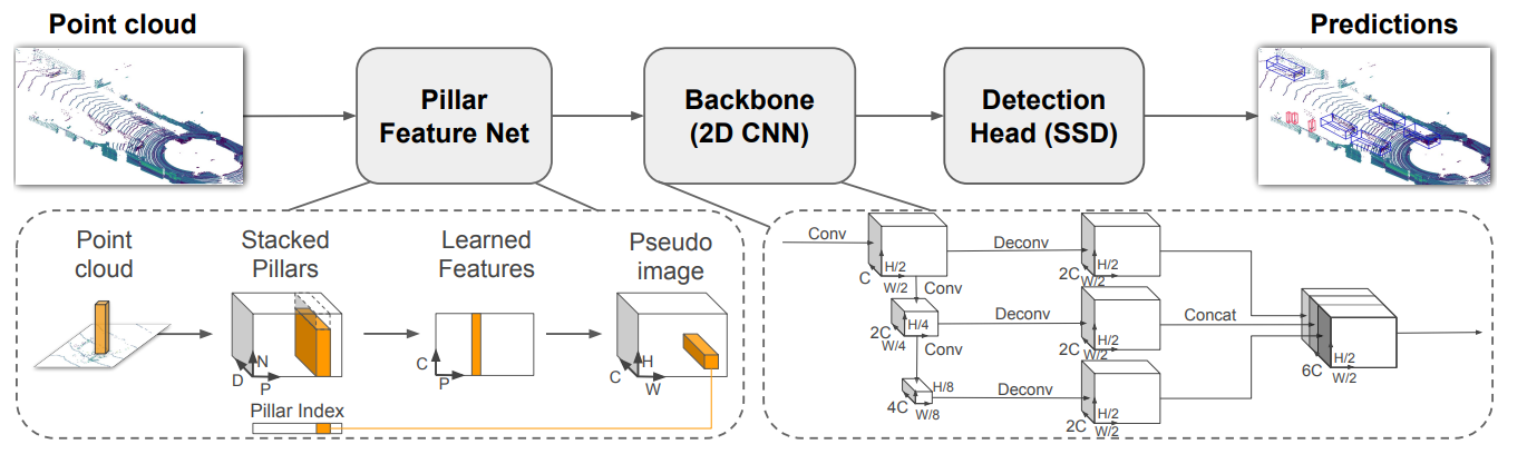 본 논문에서 제안하는 PointPillars는 2D Convolutional Layers만 사용한 E2E 학습이 가능한 3D Object Detection Method이다. PCD에 대하여 Pillar라는 PCD로 구성된 수직 기둥으로 부터 Feature를 추출하고 처리하기에, VoxelNet과 달리 수직 방향에 대한 처리가 불필요하다. 또한, 3D PCD를 Pillars로 처리하여 최종적으로 2D Convolution Layers만 활용하기 때문에 효율적이다.