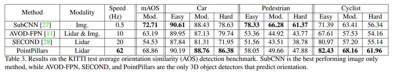 3D Oriented Boxes를 예측하기에, 방향성을 평가하는 Average Orientation Similarity(AOS) 평가지표를 비교 해 보면, PointPillars의 경우 AVOD-FPN, SECOND보다 모든 측면에서 높은 성능을 보인다. 하지만, Pedstrian의 성능이 낮음을 확인할 수 있다.