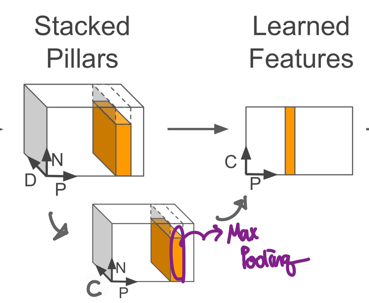 다음으로 모든 Point에 대하여 Batch Normalization, ReLU를 거쳐 $D$차원을 $C$차원으로 만들어 $(D,P,N) -> (C,P,N)$차원 변한을 통해 Feature Encoding을 수행한다. 이후 Channel 차원에 대해서 Max Pooling을 수행해서 각 Pillar를 대표하는 Feature Vector를 추출해 $(C,P,N) -> (C,P)$이 된다.