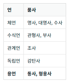 - 어미 : 용언의 어간 뒤에 붙어서 활용하면서 변하는 부분, 여러 문법적 기능을 수행.