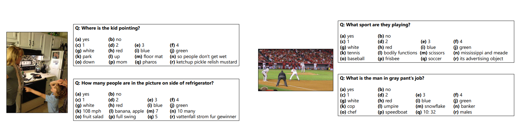 이후, VQA v2(2019) Benchmark로 업데이트 되게 되는데, 가장 큰 이유는 코퍼스 안에 존재하는 질문이나 답변이 세상에 존재하는 것들에 편향되어 있기 때문이다. 예를 들어, 가장 흔한 스포츠의 정답은 "Tennis" 이기 때문에, "What sport is"라는 질문에 답변을 하게 되면 41%의 Correct Answer를 얻을 수 있다. 또한, 대부분의 질문에 대하여 "Yes"라고 대답하면 87%라는 높은 정확도를 보이게 된다. 따라서 이러한 Dataset의 Balance를 조절한 것이 VQA v2이다.