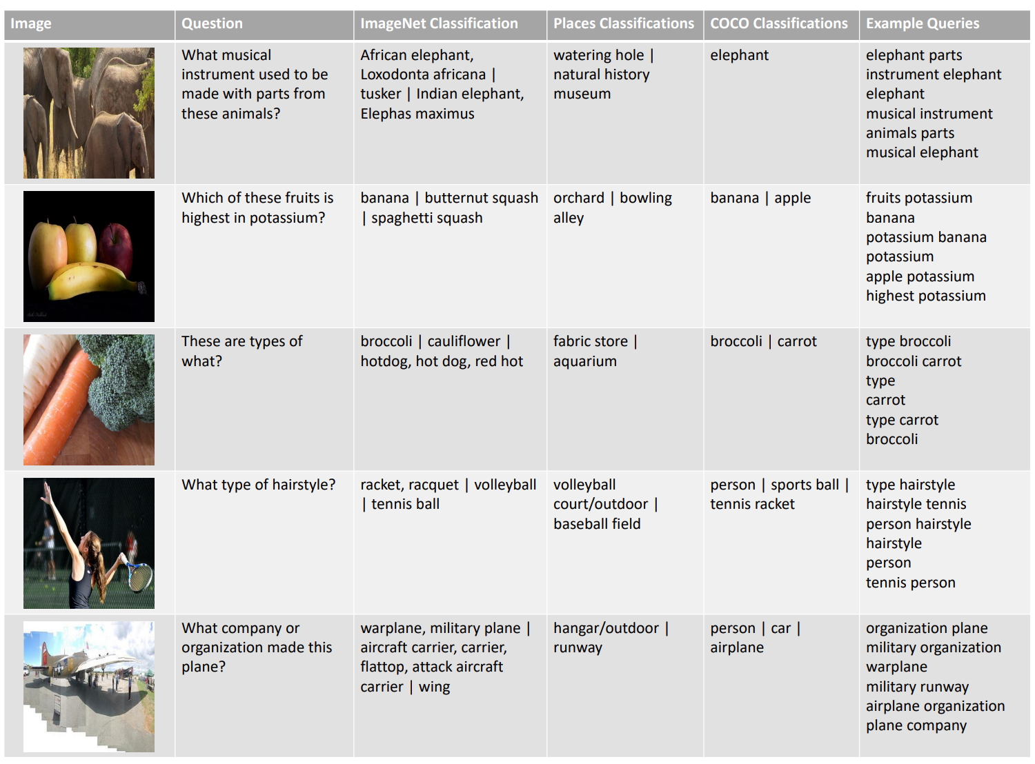 Search Query를 생성하는 방법을 조금 더 자세히 살펴보자. VQA Dataset이므로 Image, Question이 제공된다. 따라서, Question으로 부터 Non-stop Word를 추출해서 Query를 구성할 수 있다. 또한, Image로 부터 Classification Task를 수행해서 뽑아낸 Visual Entity를 재구성해서 Query를 생성할 수도 있다.