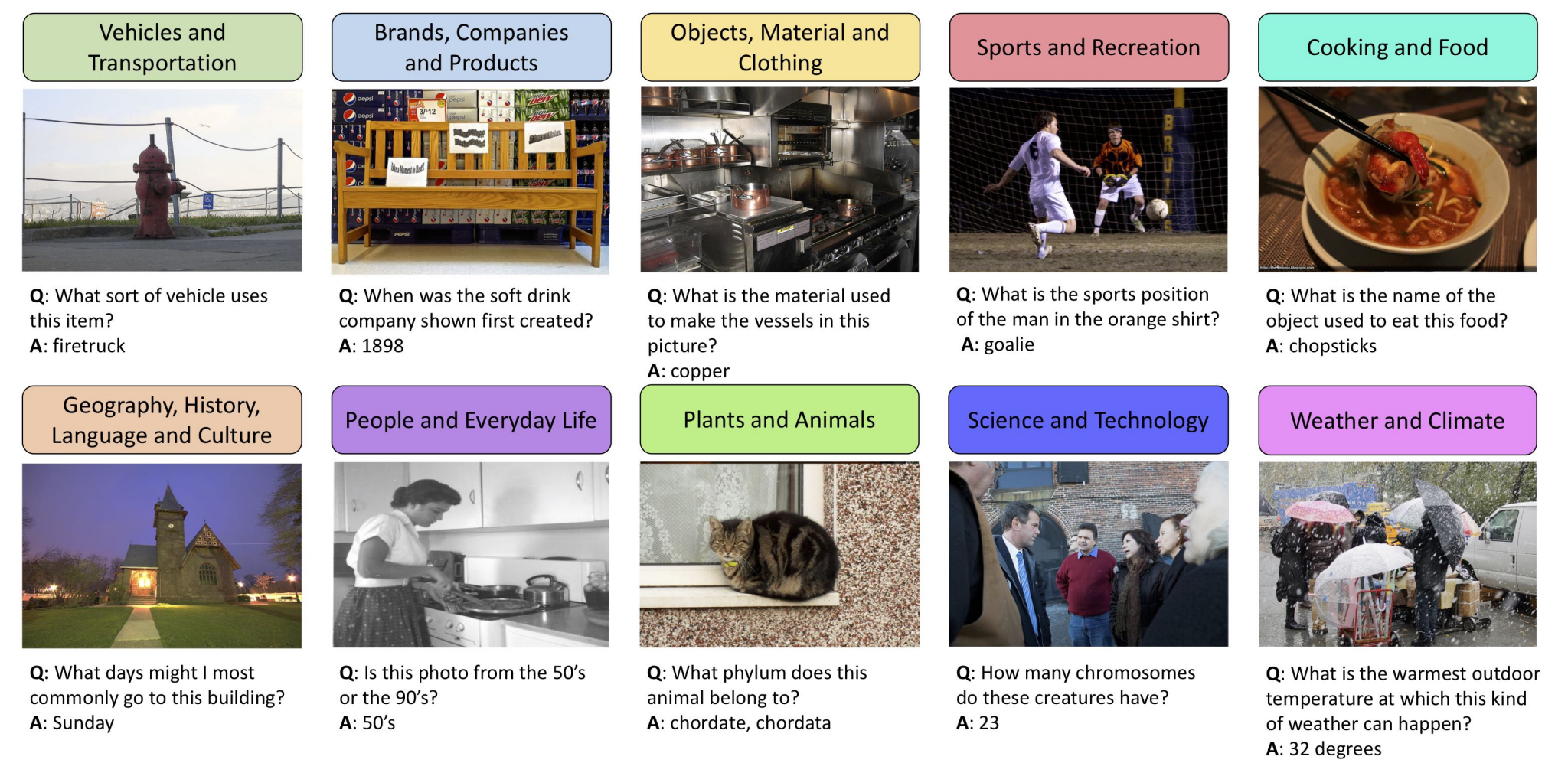 OK-VQA의 경우 다음과 같이 총 10개의 카테고리 내에서 질문과 답변이 존재하게 된다.