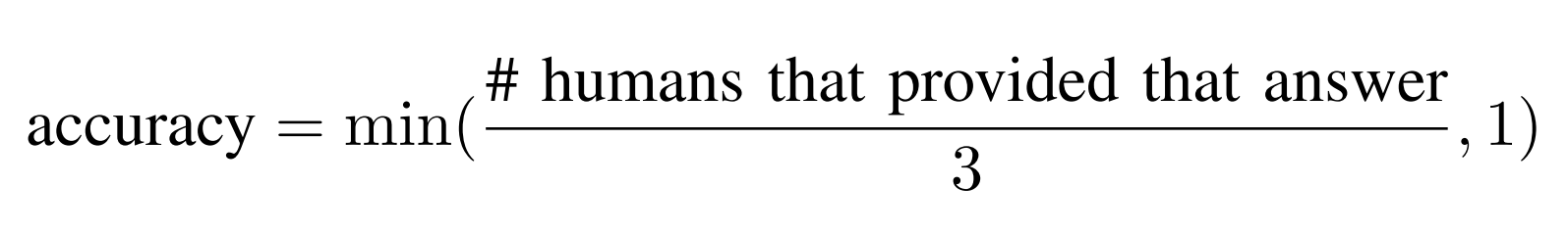 Open-ended Task는 아래의 Accuracy 지표를 통해 평가되며, 같은 정답을 최소 3명 이상의 사람이 제공한 경우 100%로 간주하게 된다. 이때, 모든 정답에 대한 간단한 전처리가 수행된 후 비교된다.