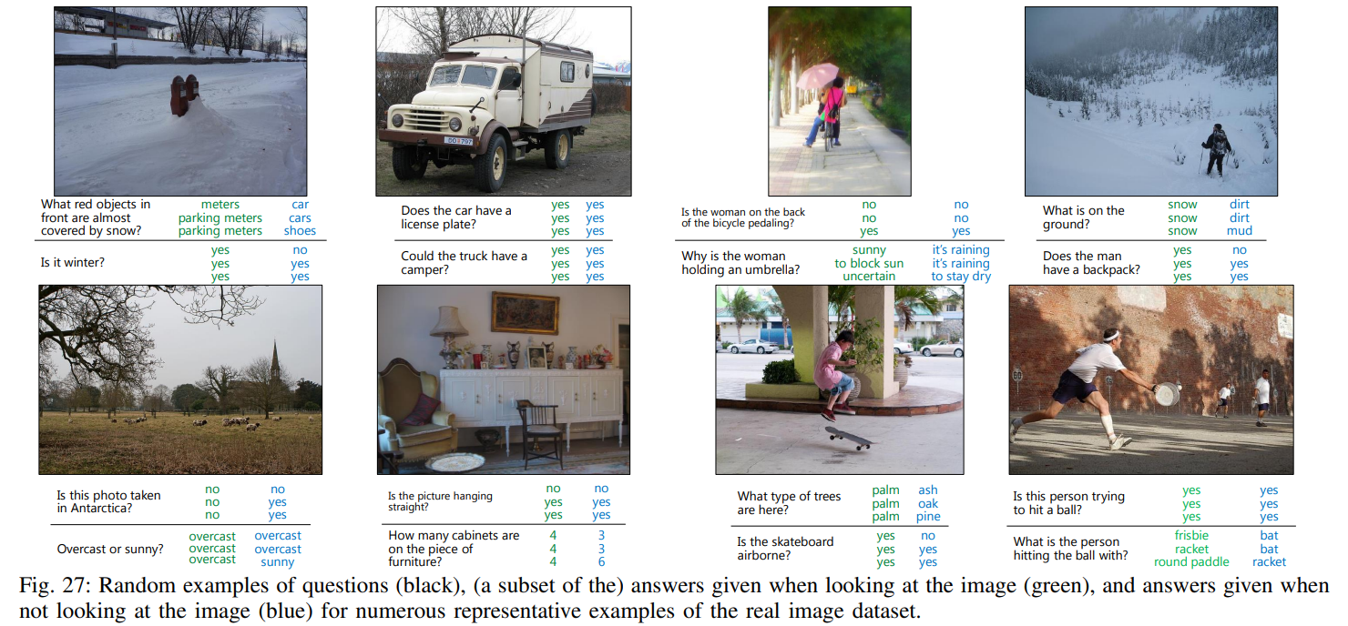 VQA Dataset에서 사용되는 Open-ended Questions는 실제 현실을 반영하기에 자주 등장하는 질문 종류, 각 질문에 잘 동작하는 Algorithm 등을 파악하기 용이하며, 실제로 매우 다양한 질문이 존재함을 확인할 수 있다. 즉, 기존의 Image Captioning Task와는 확실히 차이나는 구체성, 상식, 추론 능력을 요구하는 복합적 Multi-modal Task이다.