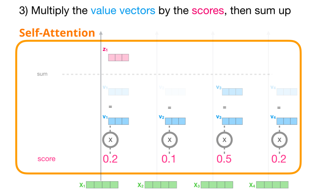최종적으로 Attention Weight와 Value Vector를 Weighted Sum 함으로써, 집중하고자 하는 Token의 값은 크게 유지하고, 불필요한 Token의 값을 매우 작게 만든다. 아래 예시에서 Attention Weight(Softmax)에 의해 각각의 Value($v_1, v_2, \cdots$)가 변형되며, 이들의 합이 $Z(z_1, z_2, \cdots)$가 된다.