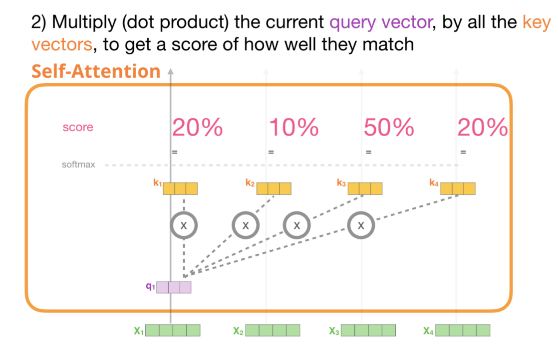 Query, Key, Value Vector를 생성한 뒤, 먼저 Query Vector와 Key Vector를 내적한 뒤, Softmax Function을 통해 Attention Score를 계산한다. 즉, 현재 표현하고자 하는 단어(Q)에 대해 어떤 단어들을 고려해야 하는지(K)를 알려주는 Score를 계산하는 것이다.