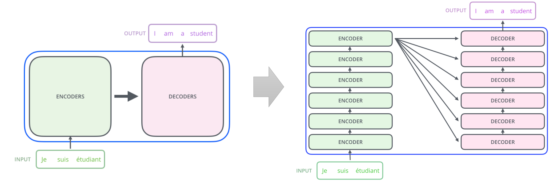 Transformer의 구조는 크게 Encoder와 Decoder 두 부분으로 구성되며, 이들은 서로 연결되어 정보를 전달한다. 논문에서는 Encoder와 Decoder 각각 6개의 동일한 레이어를 쌓은 구조를 사용하였다.