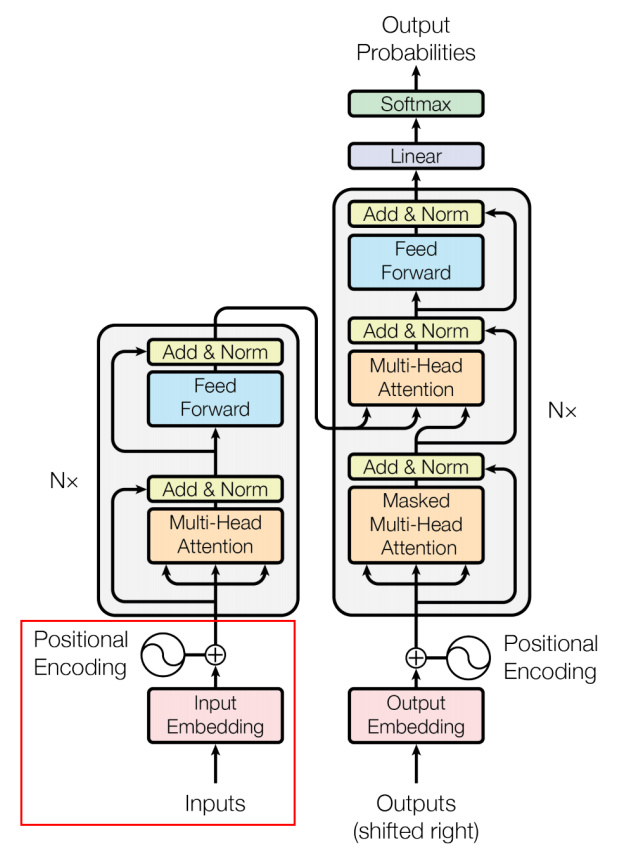 Input Embedding은 Sequence Input에 대해서 Sequence의 각 단어들을 Vector 형태로 변환하여 모델이 의미적 관계를 학습할 수 있도록 하는 과정이다. Encoder Part의 첫번째 Encoder Box의 Input으로 Word Embedding이 사용된다.