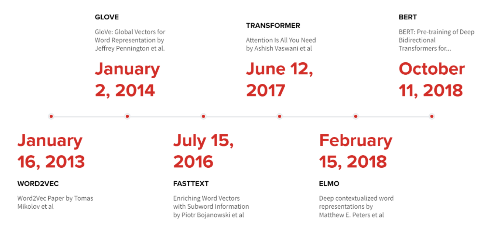 Transformer이 등장하기 이전, WORD2VEC, GLOVE, FASTTEXT 등 Word Embedding Methods 들이 안정화되었다. 이후 2017년 Attention Mechanism을 기반으로 한 Transformer가 등장하면서, 이후에는 Transformer 기반의 Model들이 연구되고 있다. 단순히 NLP 분야에만 국한되는 것이 아닌, CV 분야로 확장된 ViT 등 다양하게 활용되고 있다.