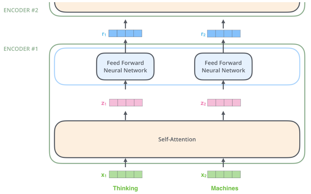 Position Encoding이 더해진 Word Embedding은 첫번째 Encoder Block의 Input으로 들어오게 된다. 각 Encoder Block은 아래와 같이 Self-Attention과 FFNN을 거치게 된다.